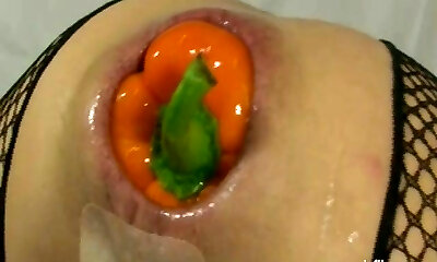 Using veggies to fuck her holes leaves her gaping wide