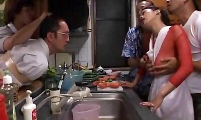 Super Hot gangbang in a classic japanese restaurant fucking hot milf
